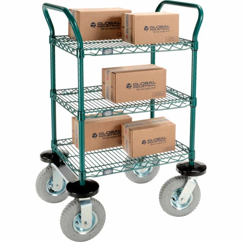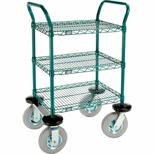 - Includes 3 shelves, 2 U handles, and 4 pneumatic casters, 2 rigid, 2 swivel, 1 tie bar