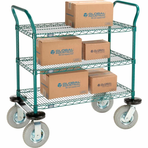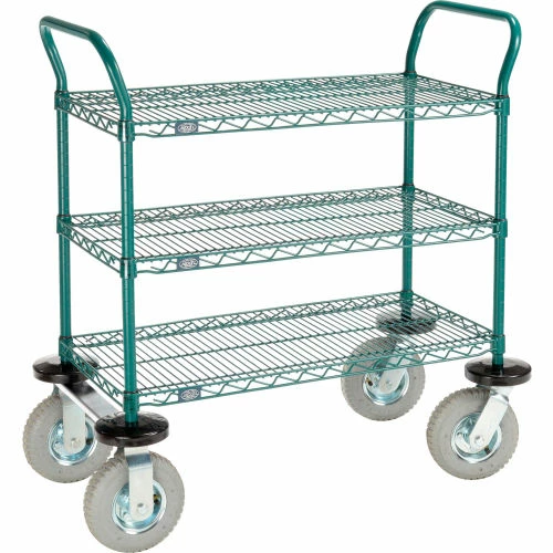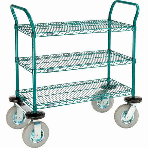 - Includes 3 shelves, 2 U handles, and 4 pneumatic casters, 2 rigid, 2 swivel, 1 tie bar