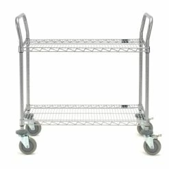 - Includes 2 shelves, 2 U handles, snap-on sleeves and polyurethane swivel casters, 2 with brakes
