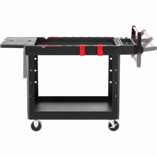 Durable structural foam construction provides superior versatility for tackling whatever task is at hand. Variable handle adjusts to four positions for comfortable handling and easier transport of awkward loads. Flip-up shelf eliminates the need to clear top shelf contents for work space. 20 lb. capacity. Slots around rim of upper shelf for storage of small tools like wrenches, pliers, or screwdrivers. Two Snap-in hooks provide additional storage options for extension cords or other items. Additional hooks sold separately. 10 lb. capacity. Small part storage near handle keeps hardware and tools organized. Cup holder included. Grooves in top shelf support 1/2″ piece of plywood (recommended plywood dimensions 32-3/8″ x 22-7/8″) to provide a flat surface for larger items and tasks. 36″ Overall height puts the top shelf at the ideal height and makes it easy to get work done at the cart. Pipe cutting V-notch prevents pipe or conduit from rolling when cutting. Holes in uprights can be threaded with pipe or conduit for rolled good or wire storage. 1 Year Limited Warranty.