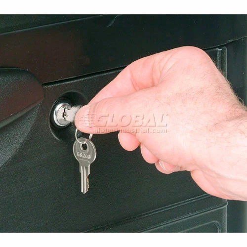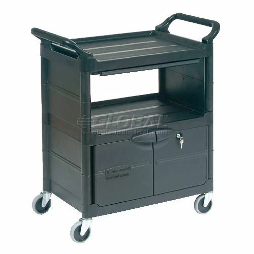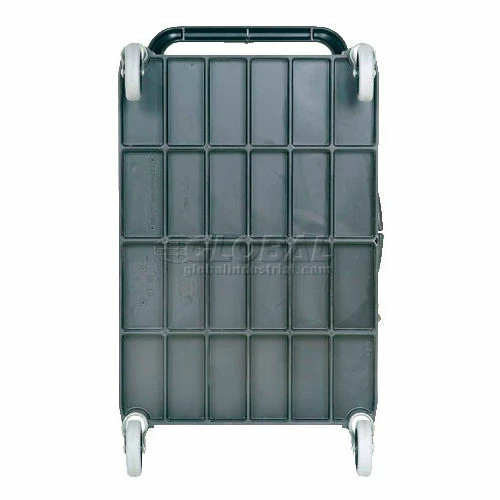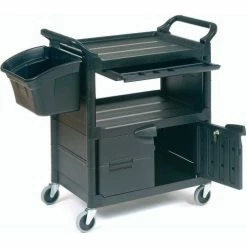 Durable and smooth plastic construction is non-conductive, easy to clean and corrosion resistant. Locking Cabinet (26″L x 17-1/2″W x 11-1/2″H) protects valuables. Sliding Top Drawer (19″L x 15-3/4″W x 1-3/4″H) offers convenient storage for tools and supplies. Shelves have lip to retain cargo. 9-3/4″ shelf clearance. Ergonomic easy-grip handles on each end offer easy steering. Rolls quietly on 4″ non-marking rubber swivel casters. Assembles easily.