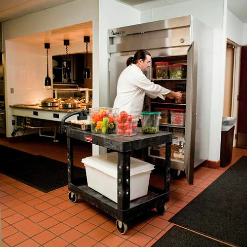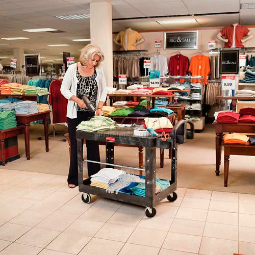 Won’t rust, dent, chip or peel. Lightweight for easy maneuverability and quiet operation. No sharp edges to nick walls or furniture. Flat shelves provide a smooth work surface and allow easy loading. Compatible with Optional Refuse/Utility Bins, Rubbermaidยฎ Commercial Optional Utility Cart Refuse/Utility Bin and Rubbermaidยฎ Commercial Utility Bin (Sold Separately). Color: Black; Capacity (Weight): 500 lb.; Caster/Glide/Wheel: Two 5″ Swivel Non-Marking Casters. 1 Year Limited Warranty.