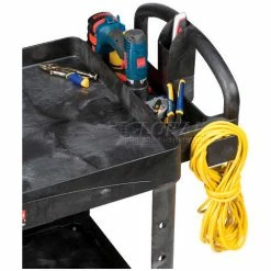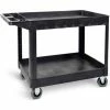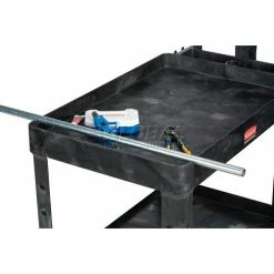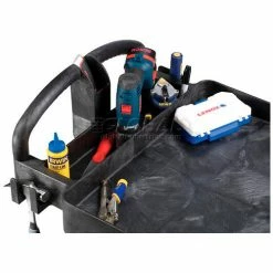 Heavy-duty structural foam plastic construction makes this cart tough enough for long, rugged use. Handles a wide variety of order picking and material handling needs in factories, hospitals and labs. Virtually maintenance free, as it won’t rust, chip or dent, never requires painting and is easily cleaned. Comfortable, taller ergonomic handle features storage bins for supplies and accessories. Side tool hooks allow hammers and cords to be carried to the job. Cart legs offer holes for adding customized spool and roll holders. Tray Shelf Cart has a 2ΒΎ” deep leak-proof top shelf to help retain cargo during transport. V-notch slots in the shelf offer a handy place to cut tubing. Lightweight cart rolls easily on 2 swivel, 2 rigid pneumatic casters. Assembles easily. 1 Year Limited Warranty.