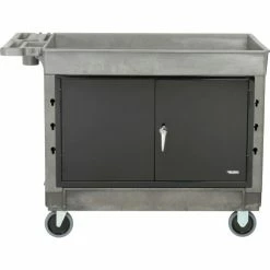 Heavy-duty structural foam plastic construction makes this cart tough enough for long, rugged use. Handles a wide variety of order picking and material handling needs in factories, hospitals and labs. Virtually maintenance free, as it won’t rust, chip or dent, never requires painting and is easily cleaned. Comfortable, taller ergonomic handle features storage bins for supplies and accessories. Side tool hooks allow hammers and cords to be carried to the job. Cart legs offer holes for adding customized spool and roll holders. Tray Shelf Cart has a 2ΒΎ” deep leak-proof top shelf to help retain cargo during transport. V-notch slots in the shelf offer a handy place to cut tubing. Lightweight cart rolls easily on 2 swivel, 2 rigid pneumatic casters. Assembles easily. 1 Year Limited Warranty.